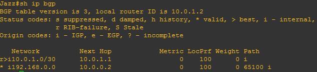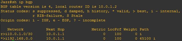 From the below you can see the next hop for 192.168.0.0 network is 10.0.0.2 which is outsite of 65000 AS, and router jazz doesn’t have a route to it. BGP will not put 192.168.0.0 into routing table because it doesn’t know how to reach next hop, you can see this below: