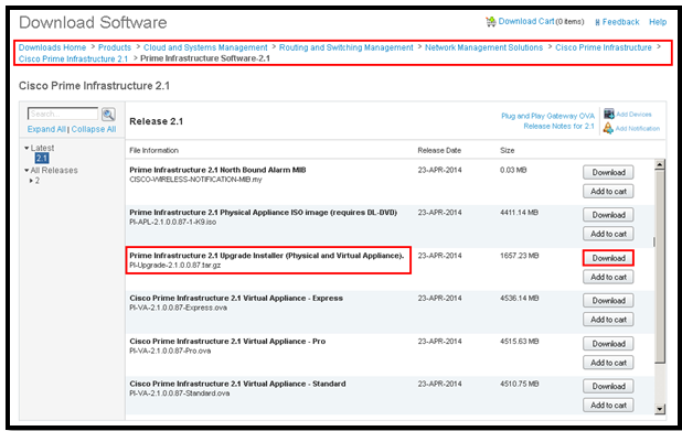 I upgraded 2.0.0.0.39 >> version 2.1 by downloading PI-Upgrade-2.1.0.0.87.gz from Cisco.com (from the below location)