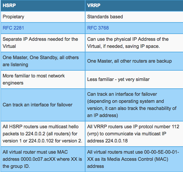 High availability gateways between multiple routers. A few options to choose from are typically HSRP (Hot Standby Routing Protocol) more common to our Cisco friends, or the more widely used standards based VRRP (Virtual Route Redundancy Protocol), of course there’s GLBP too but i’ll leave that one for a rainy day, all of which are FHRP (First Hop Routing Protocols).
